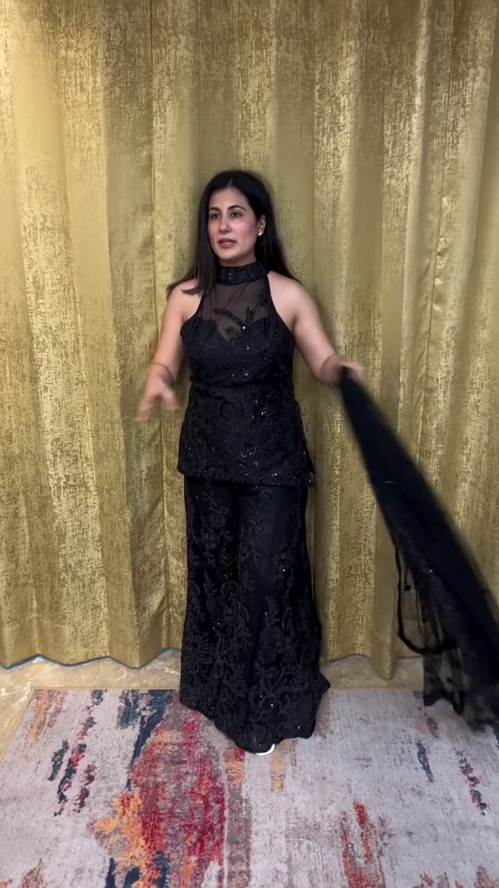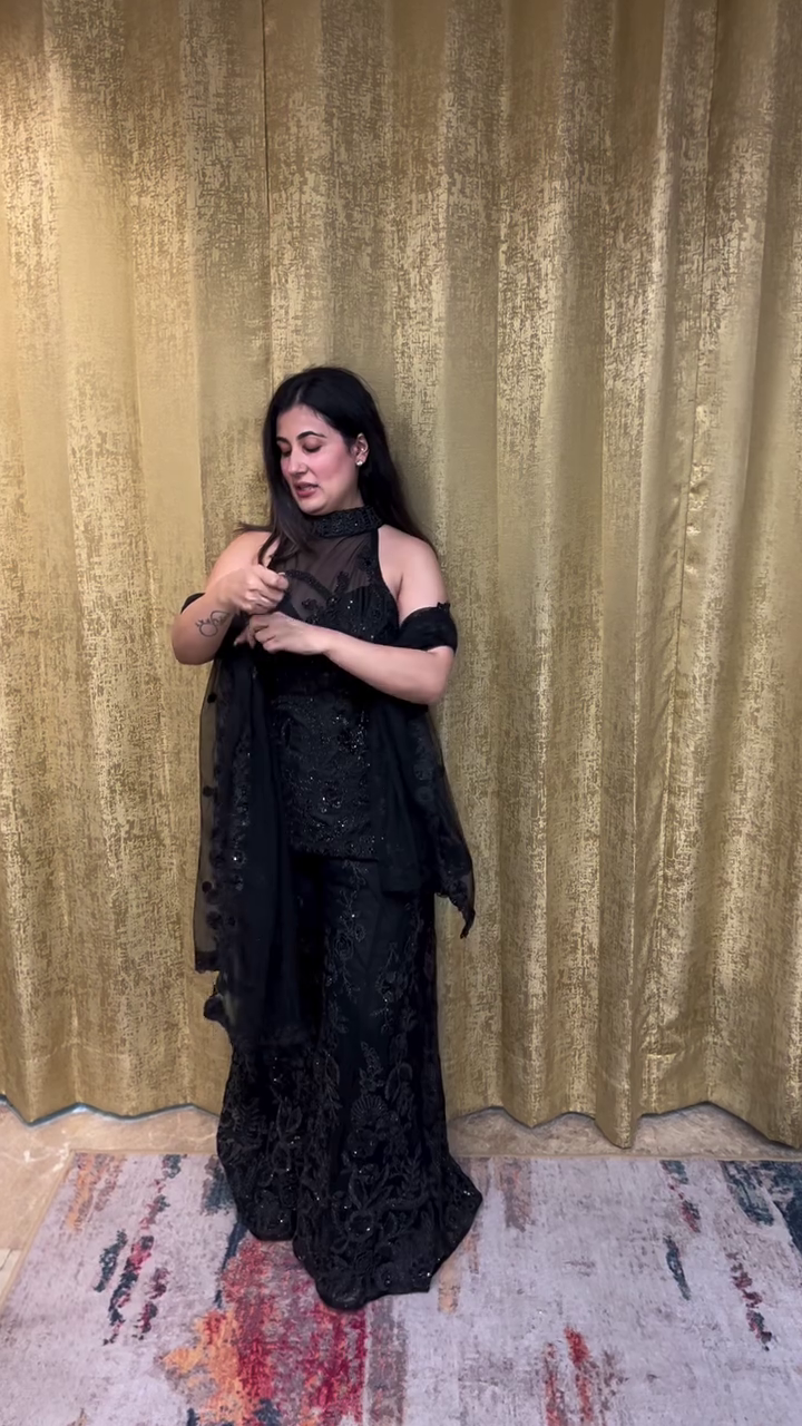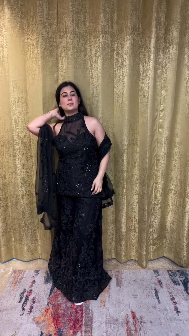 Step into timeless sophistication with this Midnight Glam Embroidered Sharara Set, a masterpiece that captures the beauty of modern Indian elegance. Crafted with intricate details and luxurious texture, this all-black outfit effortlessly blends classic charm with contemporary grace — making it a must-have for every fashion-forward woman.