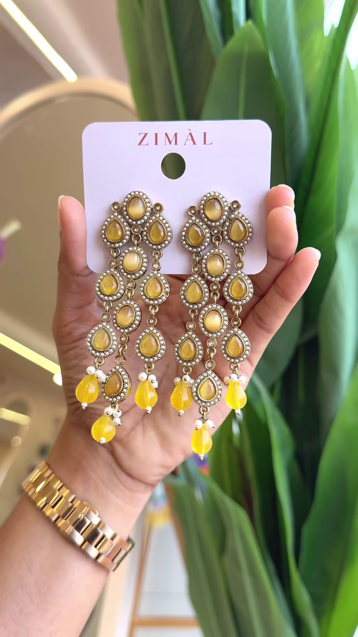 The cascading teardrop design features delicate yellow gemstones, encased in intricate metalwork that adds a vintage allure. Each shimmering drop sways gracefully with movement, catching the light and creating a mesmerizing effect. The tiny pearl accents at the base enhance the earrings’ luxurious appeal, making them a breathtaking statement piece for any occasion.