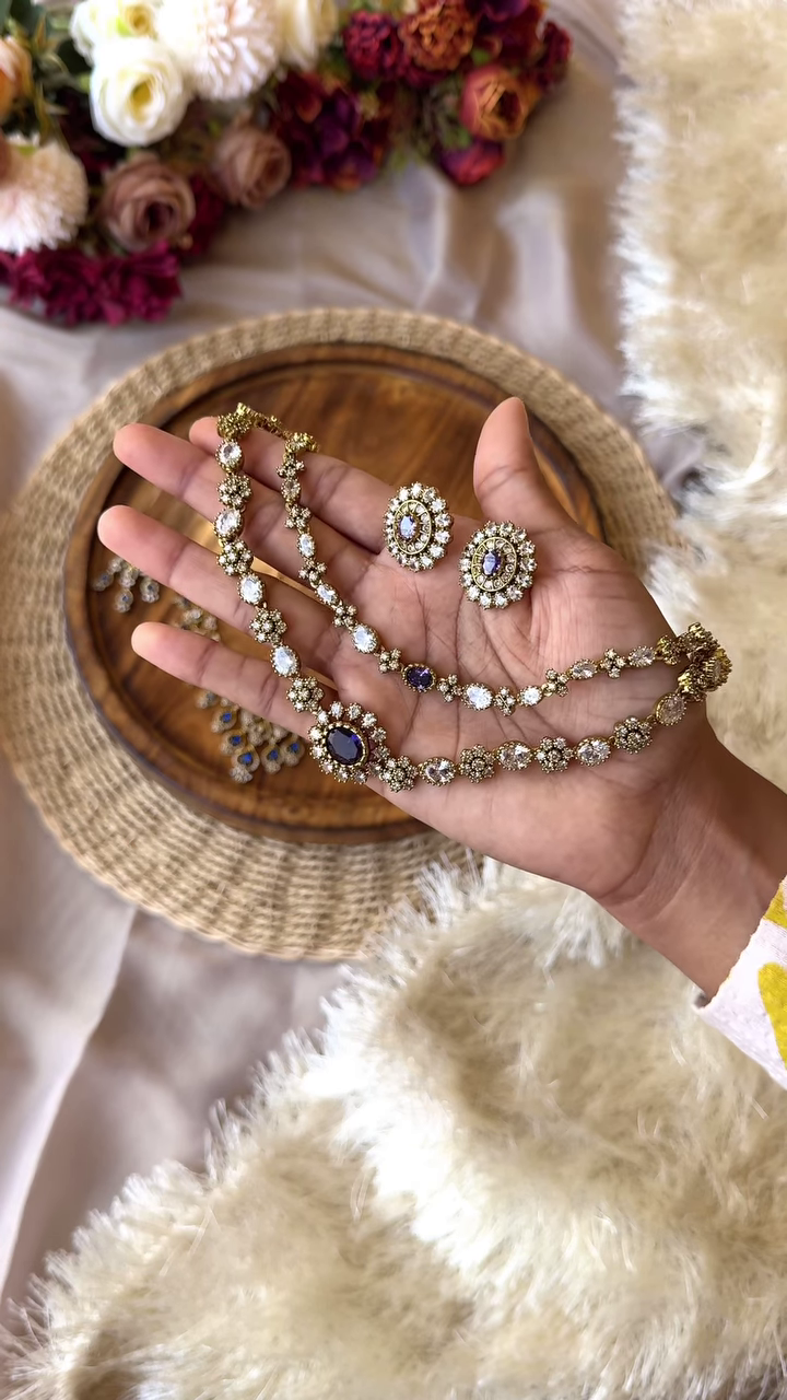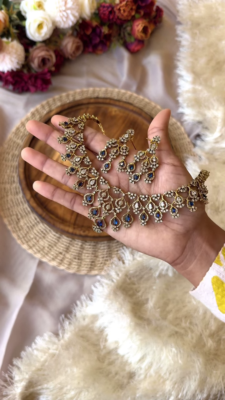 From intricately studded chokers to delicately crafted necklaces, this collection features a mesmerizing blend of gold-toned metal, sparkling stones, and delicate embellishments. The ornate designs reflect the legacy of traditional craftsmanship, reminiscent of royal heirlooms passed down through generations. The interplay of deep sapphire blues, radiant crystal whites, and multicolored gems enhances the versatility of this collection, making it perfect for weddings, festive gatherings, and cultural celebrations.