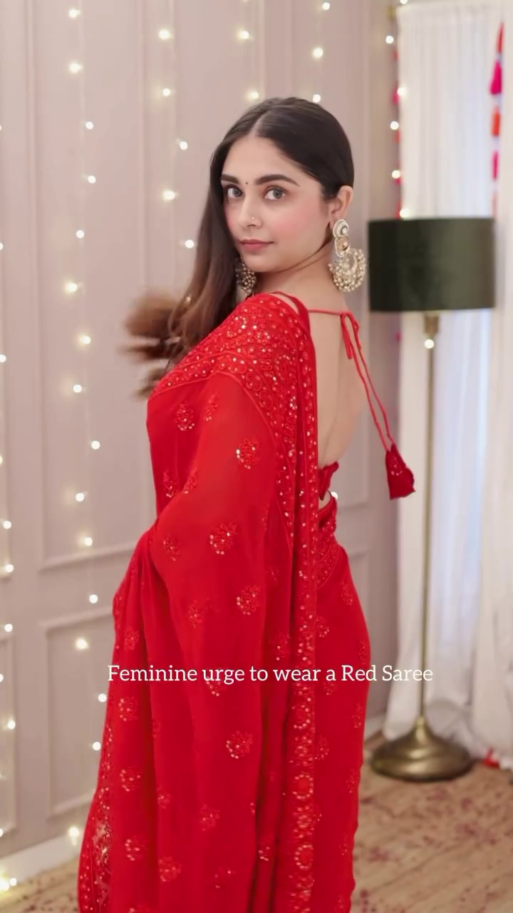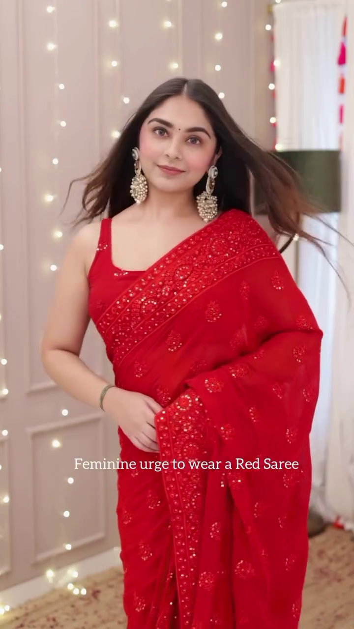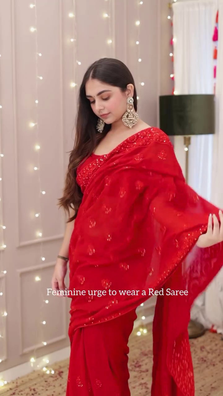 The saree features a rich red hue, beautifully enhanced with delicate embroidery and sequin detailing that catch the light with every movement. 🌟 Its intricate patterns add a traditional yet contemporary appeal, making it a versatile piece for multiple occasions. Draped gracefully, it flatters your silhouette while exuding poise and sophistication. 💃