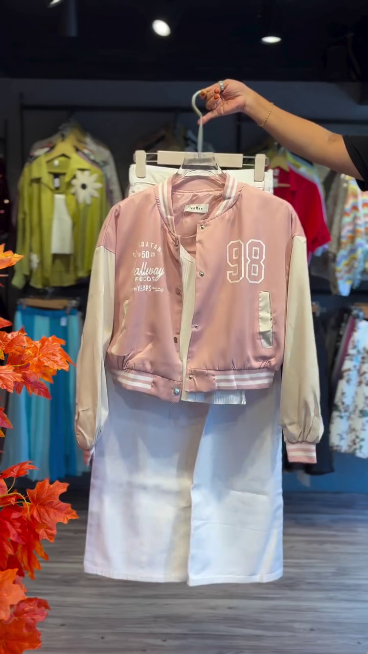 This trendy co-ord set includes a cropped varsity-style jacket and matching wide-leg pants, crafted to give you a flattering yet relaxed silhouette. The soft blush pink jacket features classic varsity detailing with contrast sleeves, snap-button closure, ribbed cuffs, and sporty typography accents that add a youthful, street-style vibe 🧥🔥. Paired with high-waist white wide-leg pants, the look feels clean, modern, and effortlessly chic.