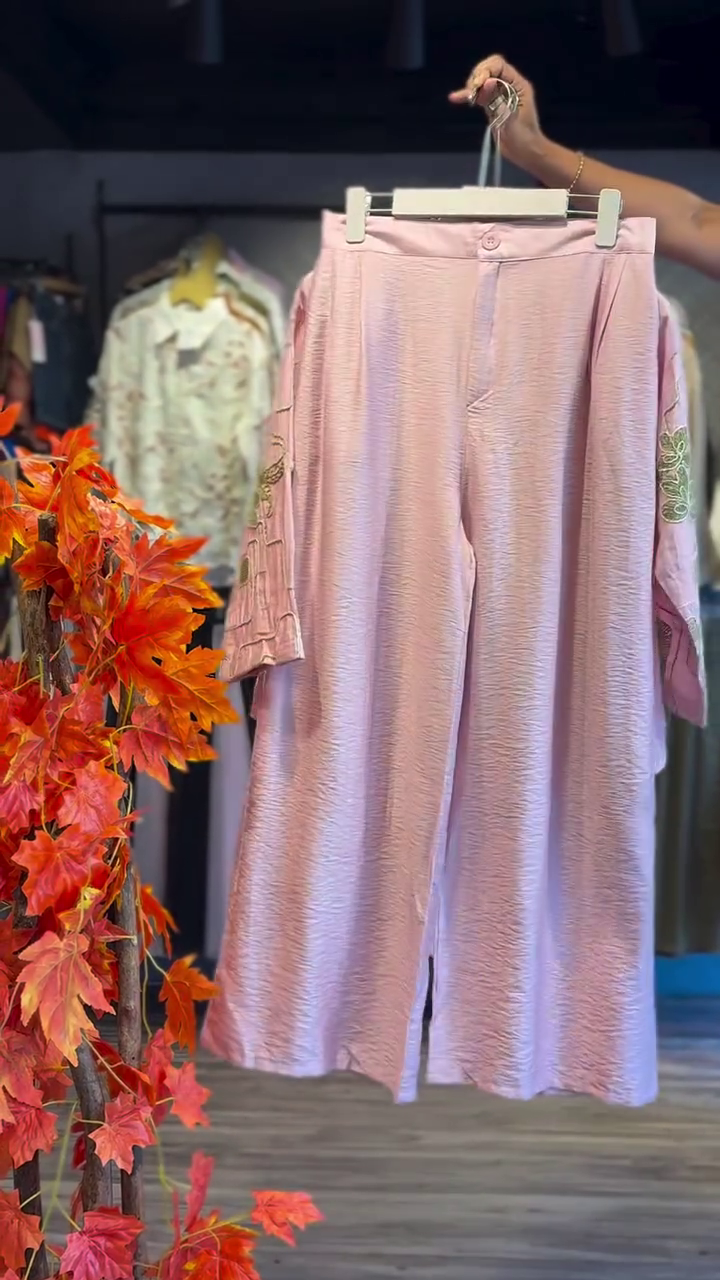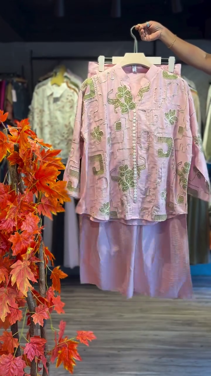 Paired with matching bottoms — straight pants, palazzos, or churidars — the set ensures a coordinated, polished appearance. The tonal pink color palette enhances the delicate embroidery, creating a harmonious, feminine ensemble that works beautifully for both daytime and evening occasions. ✨💖