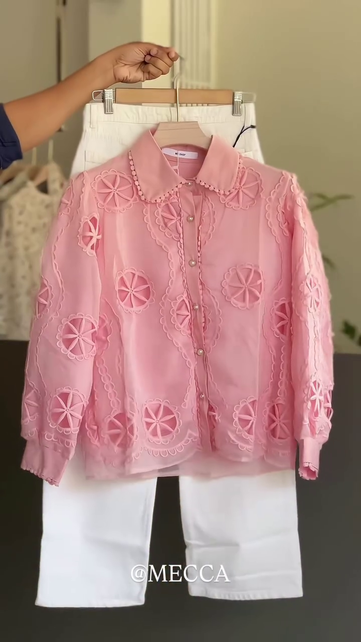 The pink sheer shirt is crafted from a lightweight, breathable fabric that drapes beautifully, offering a soft, airy feel 🌬️. What truly sets it apart is the intricate floral embroidery featuring circular lace-inspired patterns, evenly placed to create a refined and graceful look 🌸. The embroidery adds texture and depth while maintaining a subtle, classy finish.