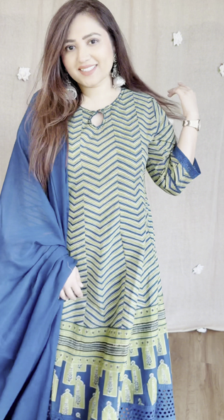 The coordinating churidar, leggings, or palazzo pants provide a balanced silhouette while maintaining the ensemble’s elegance. A matching dupatta with delicate borders or embroidery completes the look, offering versatility and enhancing the overall appeal. 🌿