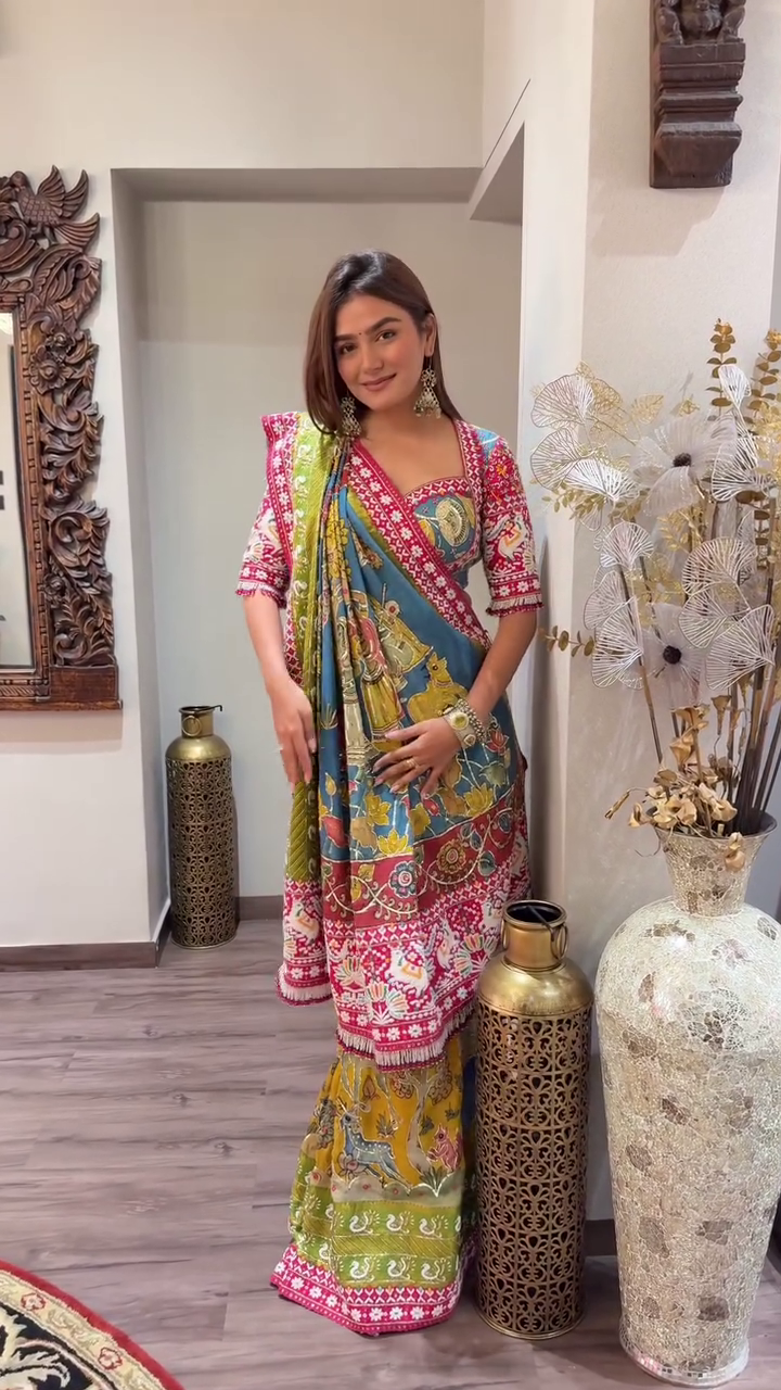 🌺 Multicolor Traditional Printed Saree with Intricate Ethnic Detailing 🌺