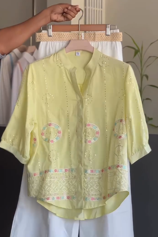 The top is made from premium viscose flex fabric, ensuring softness, breathability, and a comfortable stretch for all-day wear 🌬️. Its intricate embroidery adds a feminine and refined touch, elevating a simple yellow top into a statement piece 🎨. The flattering cut complements various body types, creating a graceful and polished silhouette 👌.