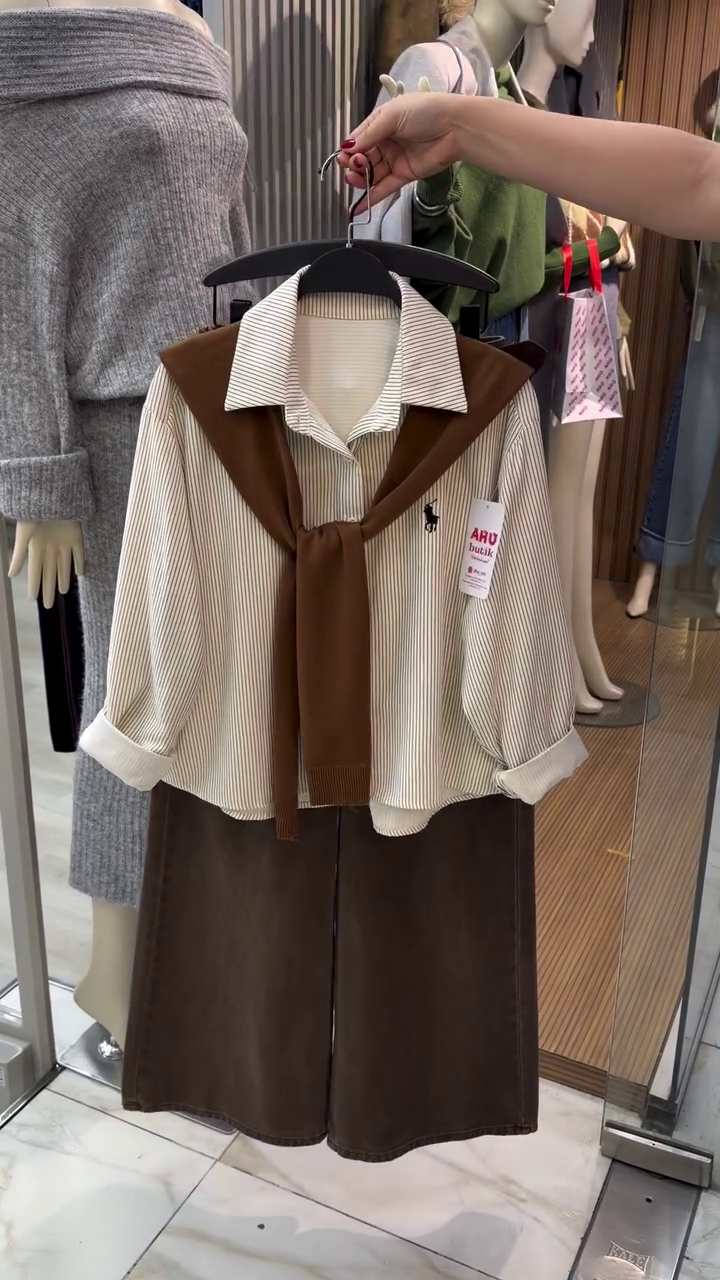 The highlight of this outfit is the detachable brown sweater scarf 🤎. This cozy knit accessory adds warmth and texture while instantly elevating your style. The detachable feature allows you to switch up your look effortlessly – wear it for a layered winter vibe or remove it for a light and minimal outfit during warmer hours. The rich brown tone complements the stripes beautifully, creating a balanced and fashionable contrast.
