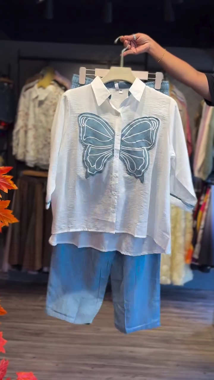 The button-down shirt is the focal point of this set. Its long sleeves, crisp collar, and front buttons create a classic shirt silhouette, while the butterfly embroidery adds an unexpected, whimsical detail. The embroidery draws attention subtly, giving the shirt personality without overpowering the look. The relaxed fit ensures comfort while maintaining a polished appearance. 🦋🧵