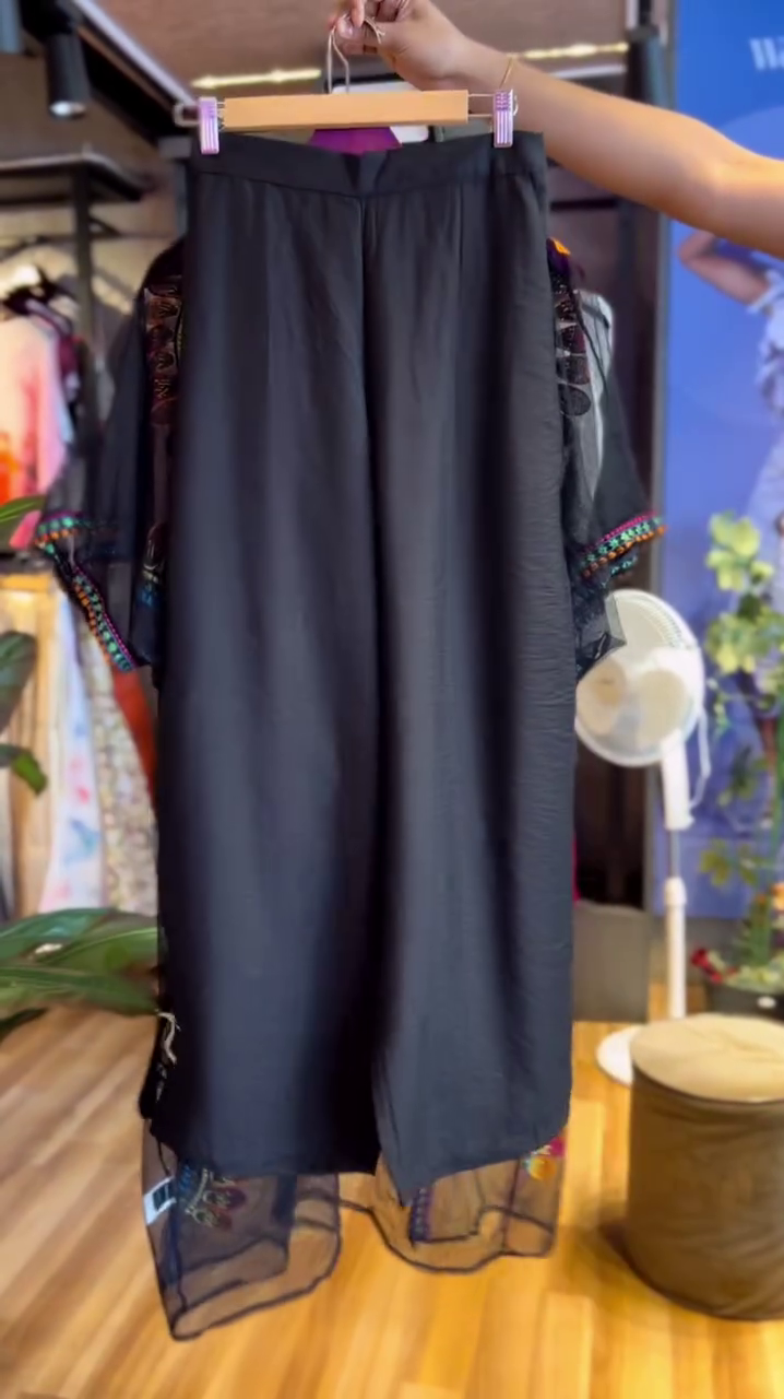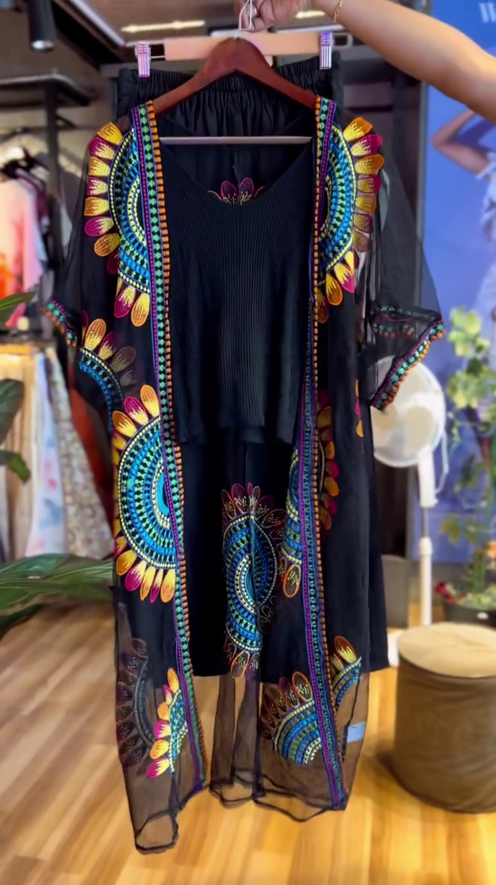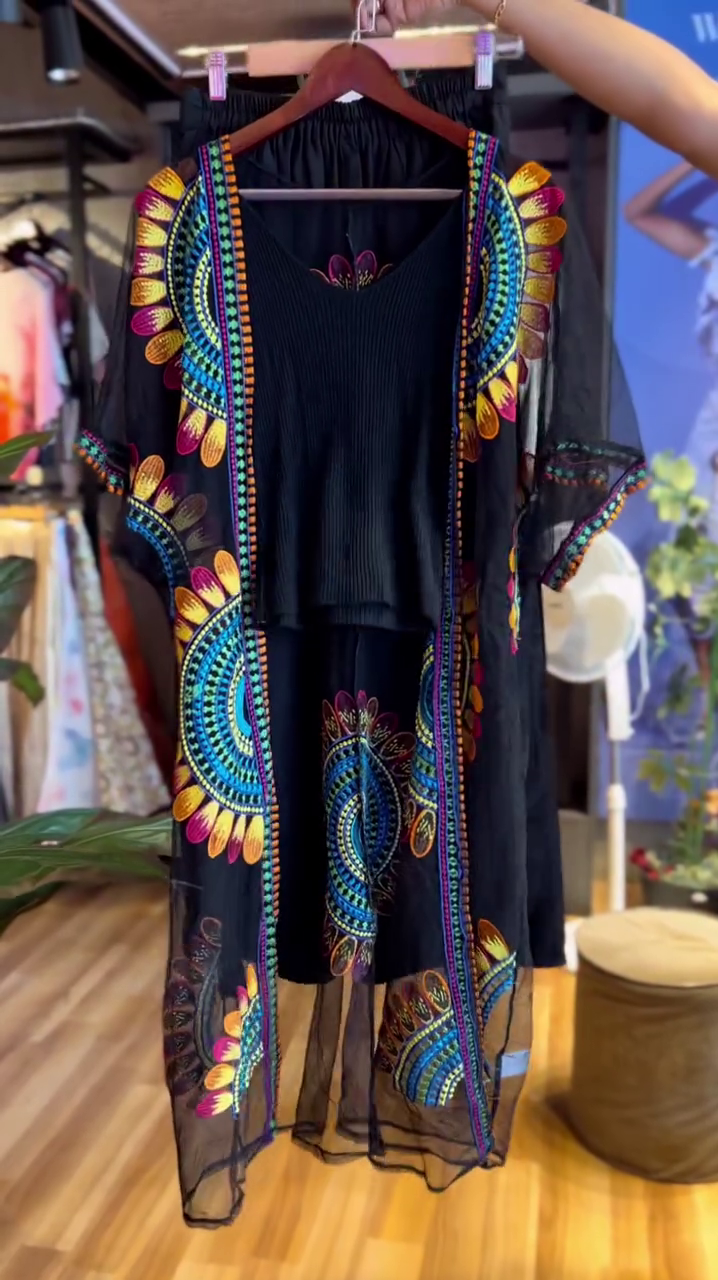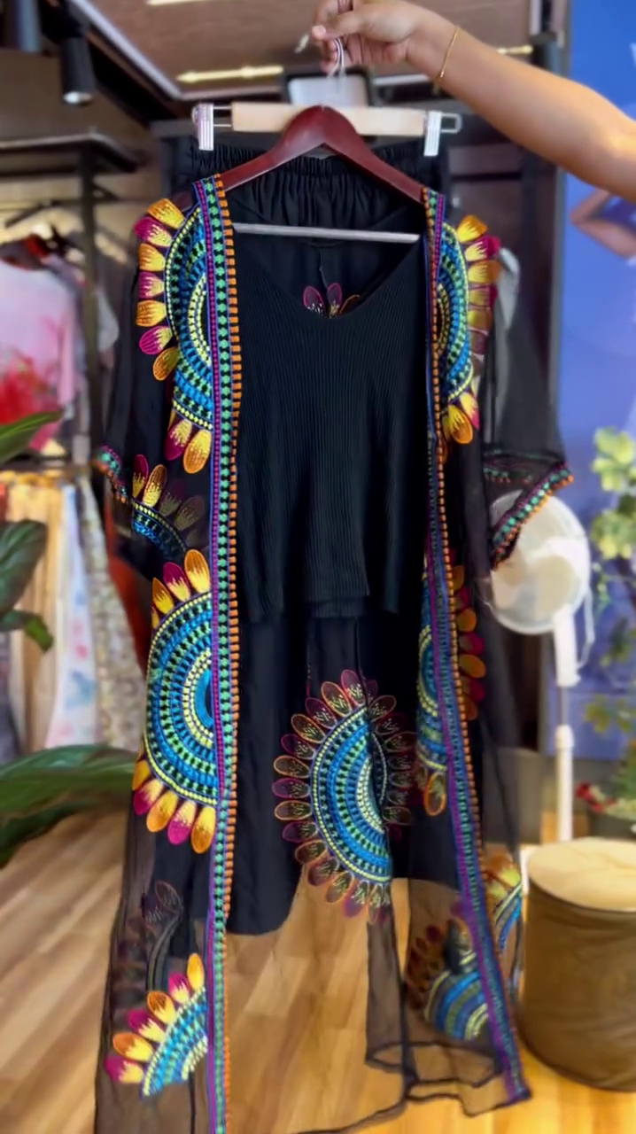 - Color:Â Predominantly black with colorful embroidered motifs (blue, orange, pink, and green).