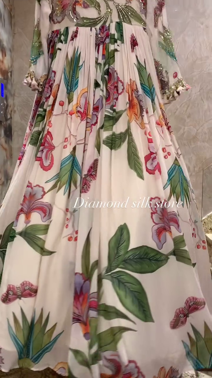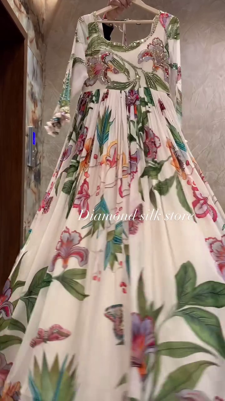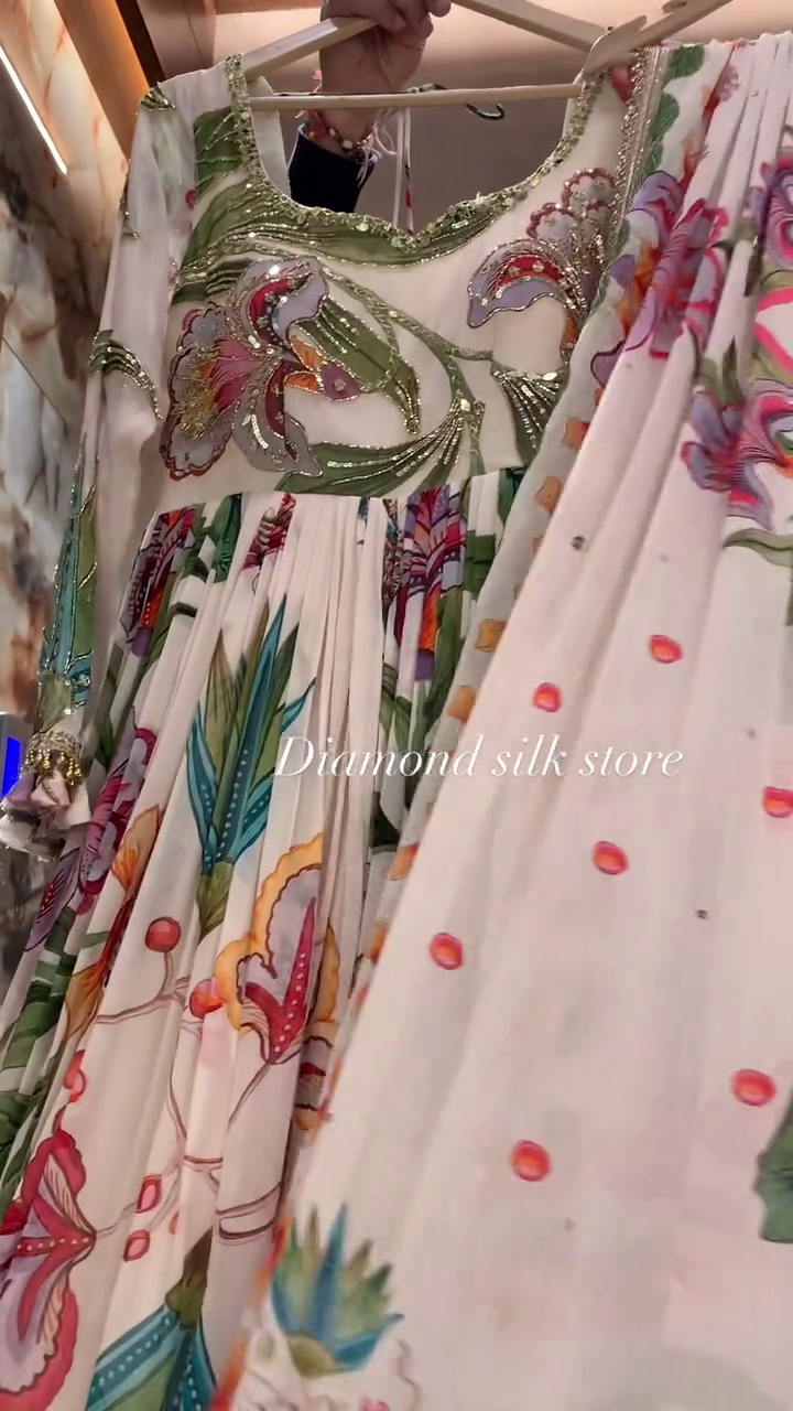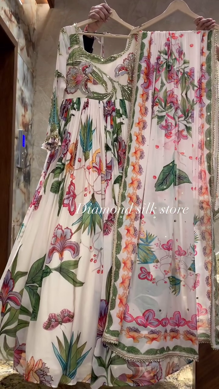 • This stunning Anarkali dress features a vibrant floral design, embodying elegance and tradition. Perfect for weddings, festive gatherings, or special occasions.