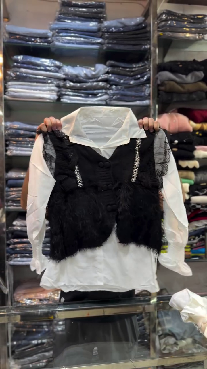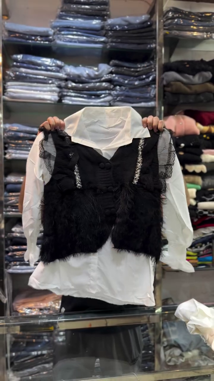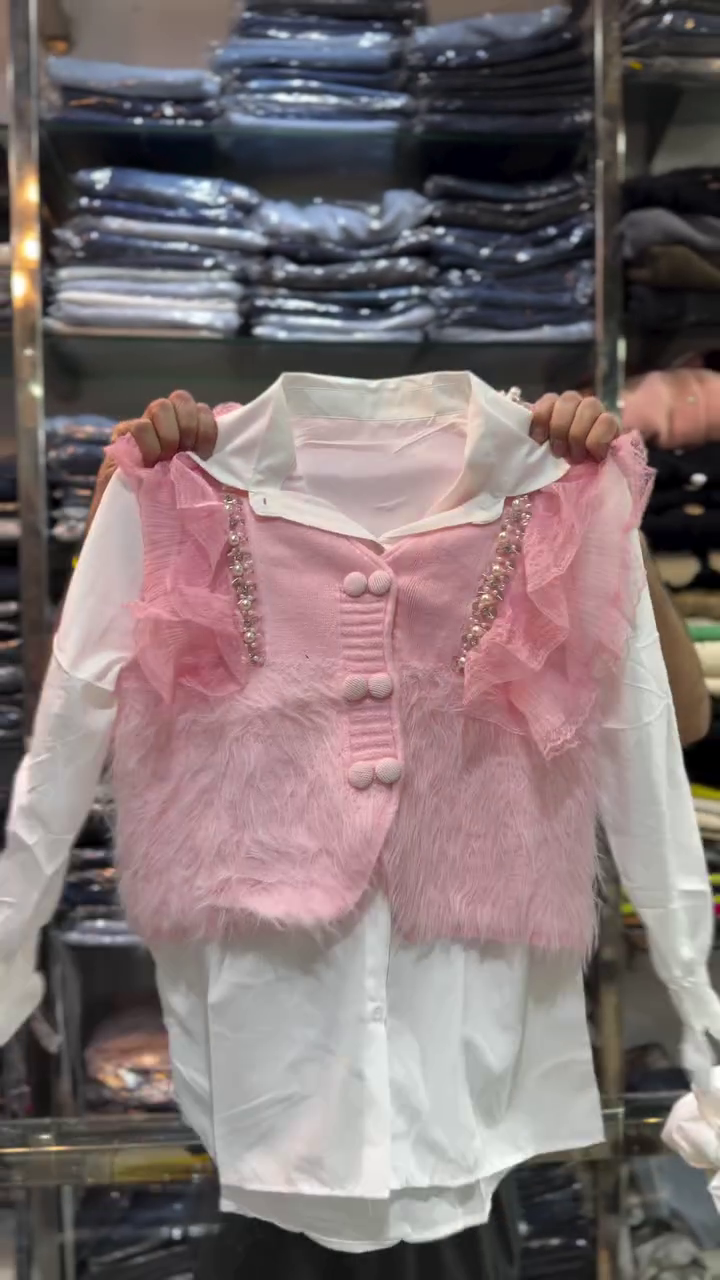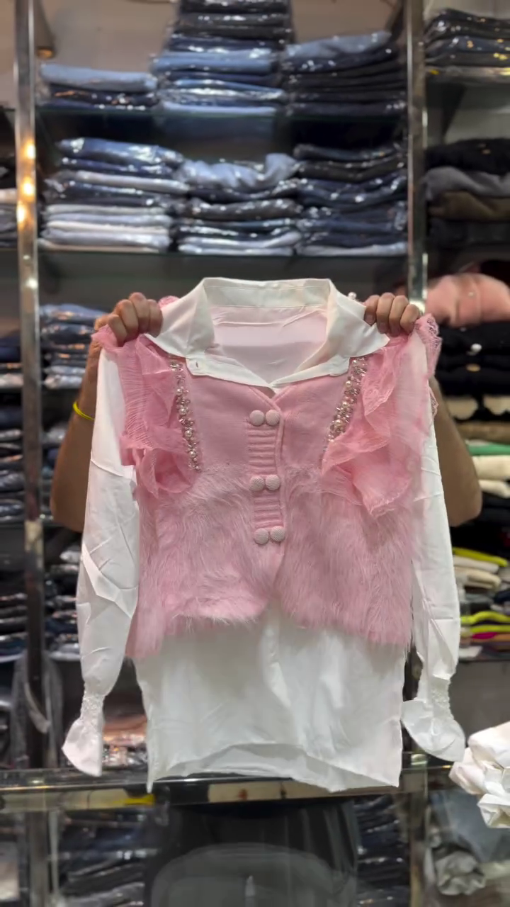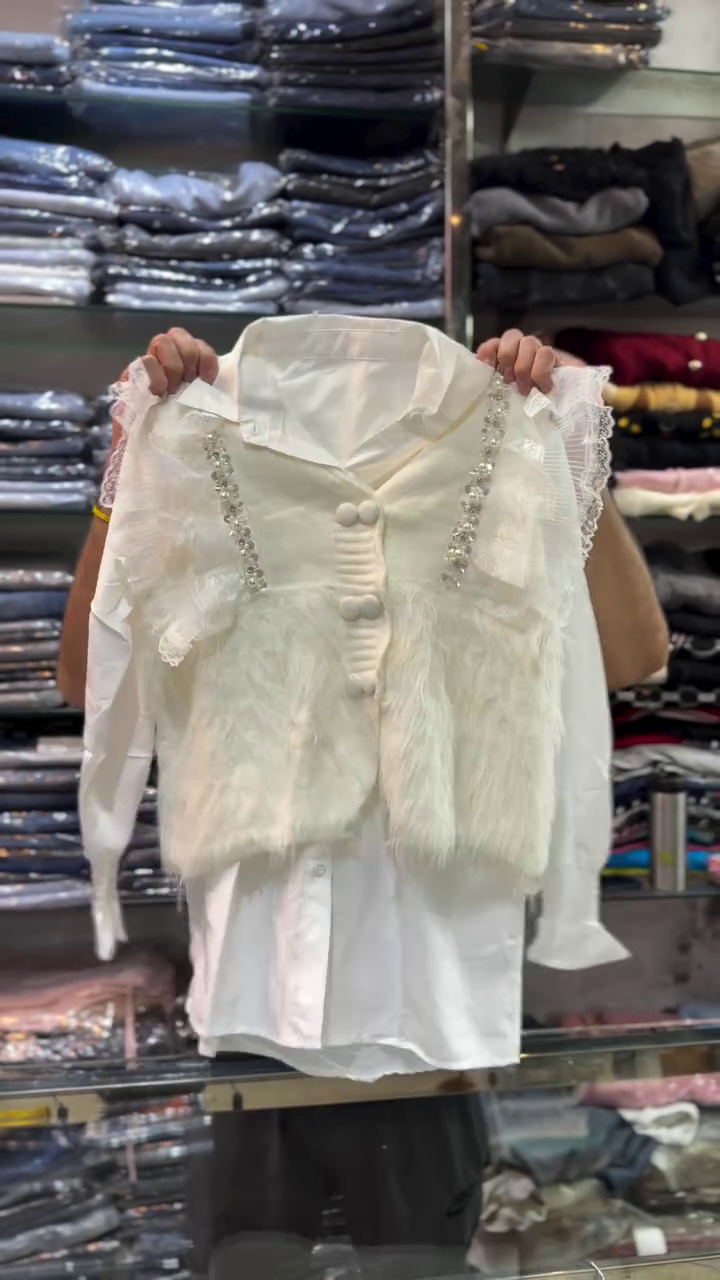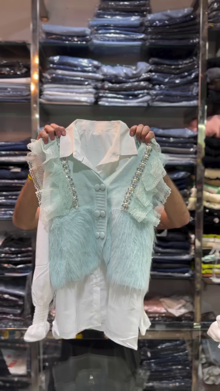 Introducing our Luxury Faux-Fur Layered Shirt Top, a statement piece designed for girls and women who love classy winter outfits with a touch of glamour. This exclusive top combines a crisp white shirt inner with a soft faux-fur vest, beautifully decorated with pearls, lace ruffles and sparkling stone work ✨.