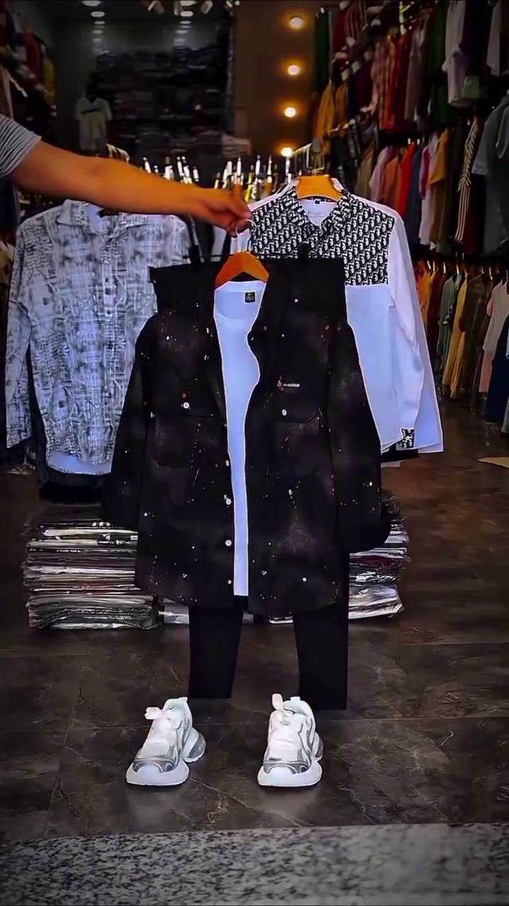 Step into effortless style with this complete men’s apparel set featuring a black speckled jacket, white and patterned shirts, black pants, and white chunky sneakers. Designed for the modern man who values versatility, comfort, and trend-forward looks, this outfit is perfect for casual outings, weekend adventures, or urban streetwear vibes.
